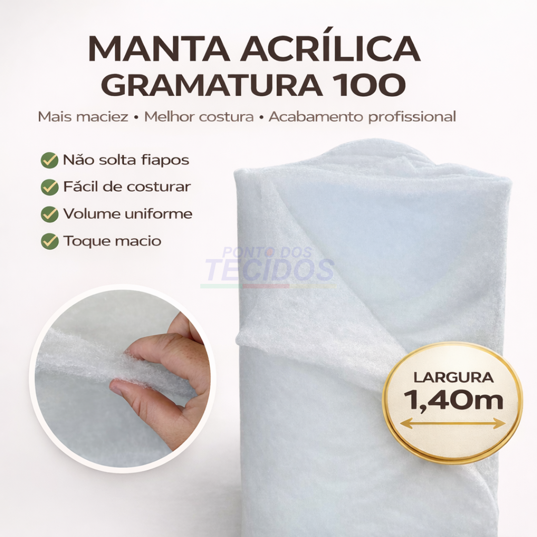 A Manta Acrílica Gramatura 100 é vendida por metro, com 1,40m de largura.
