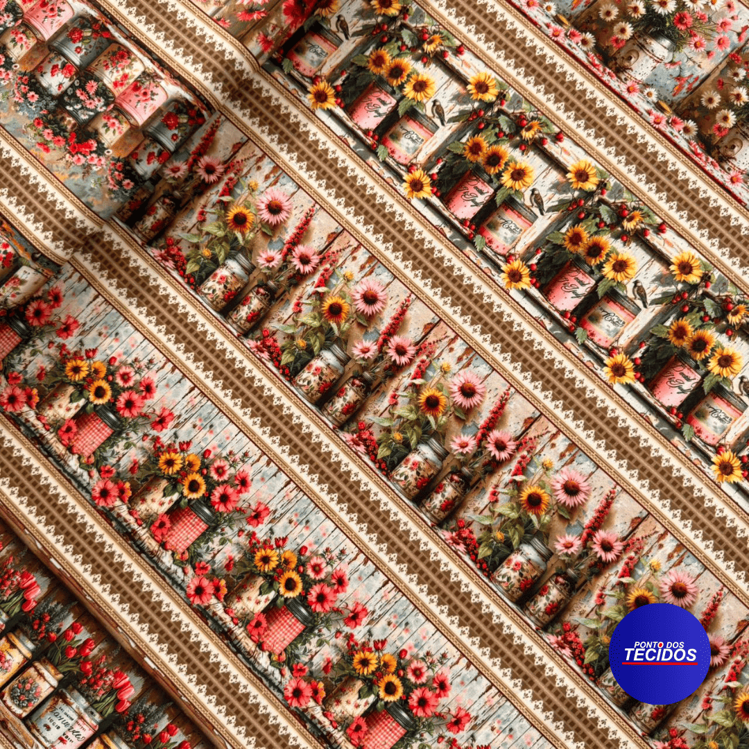 Tecido Tricoline Barrada Digital 10 Barrados 100% Algodão - 0,55cm X 1,50m - Latas e Flores 2584