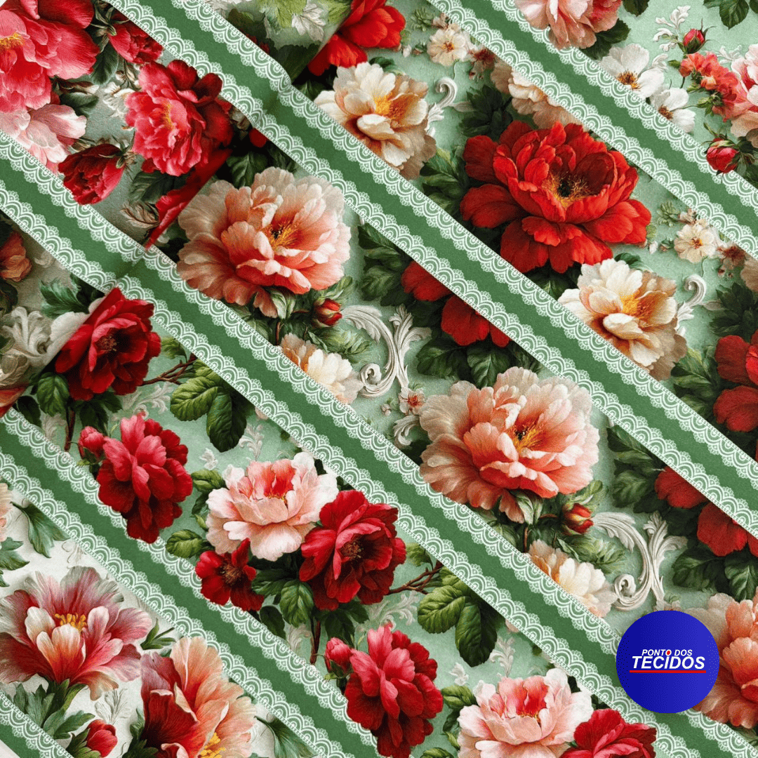 Com 1,50m de largura, o tecido possui 10 barrados distribuídos de forma uniforme, permitindo cortes precisos e melhor aproveitamento da estampa.