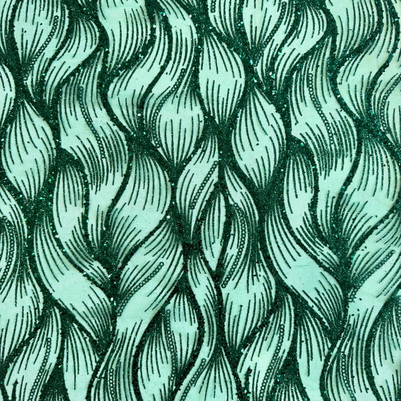 Produzido em 100% Poliamida, o Tule Glitter Arabesco Ondulado possui 1,50m de largura e gramatura de 180 g/m², garantindo um tecido com presença visual e excelente estrutura para aplicações decorativas e moda festa.